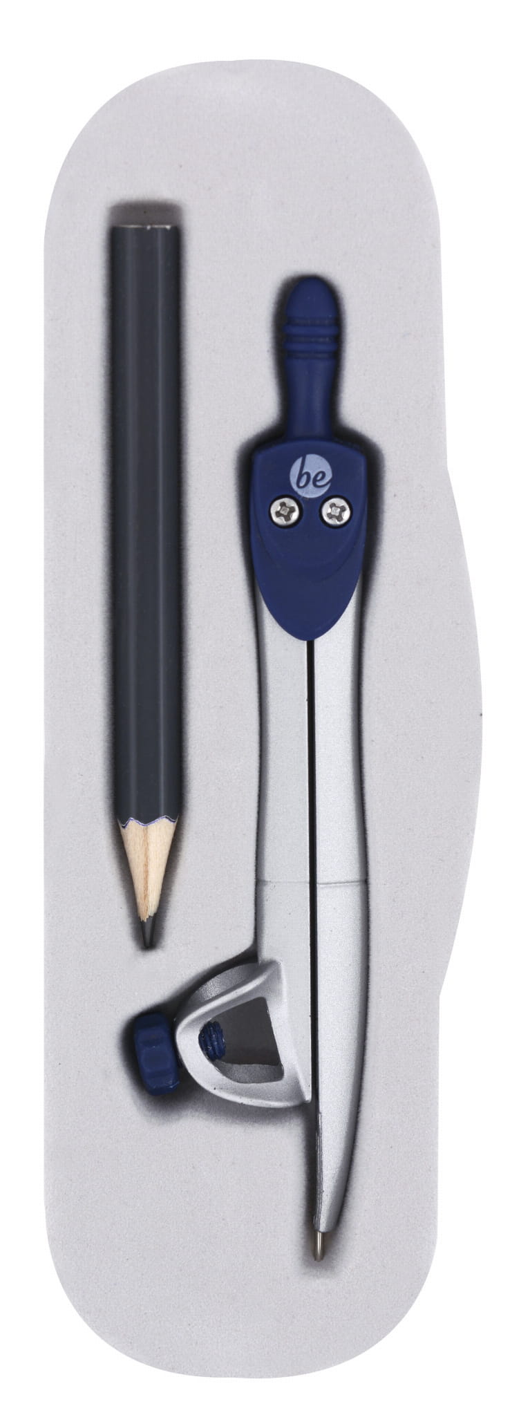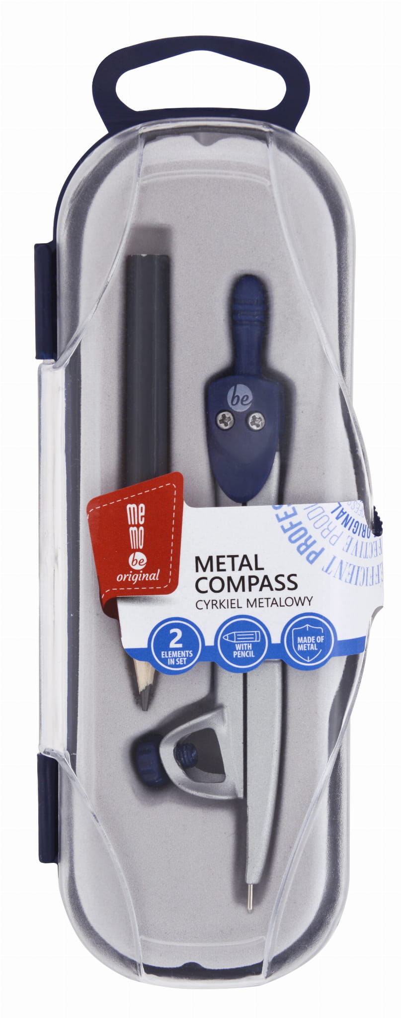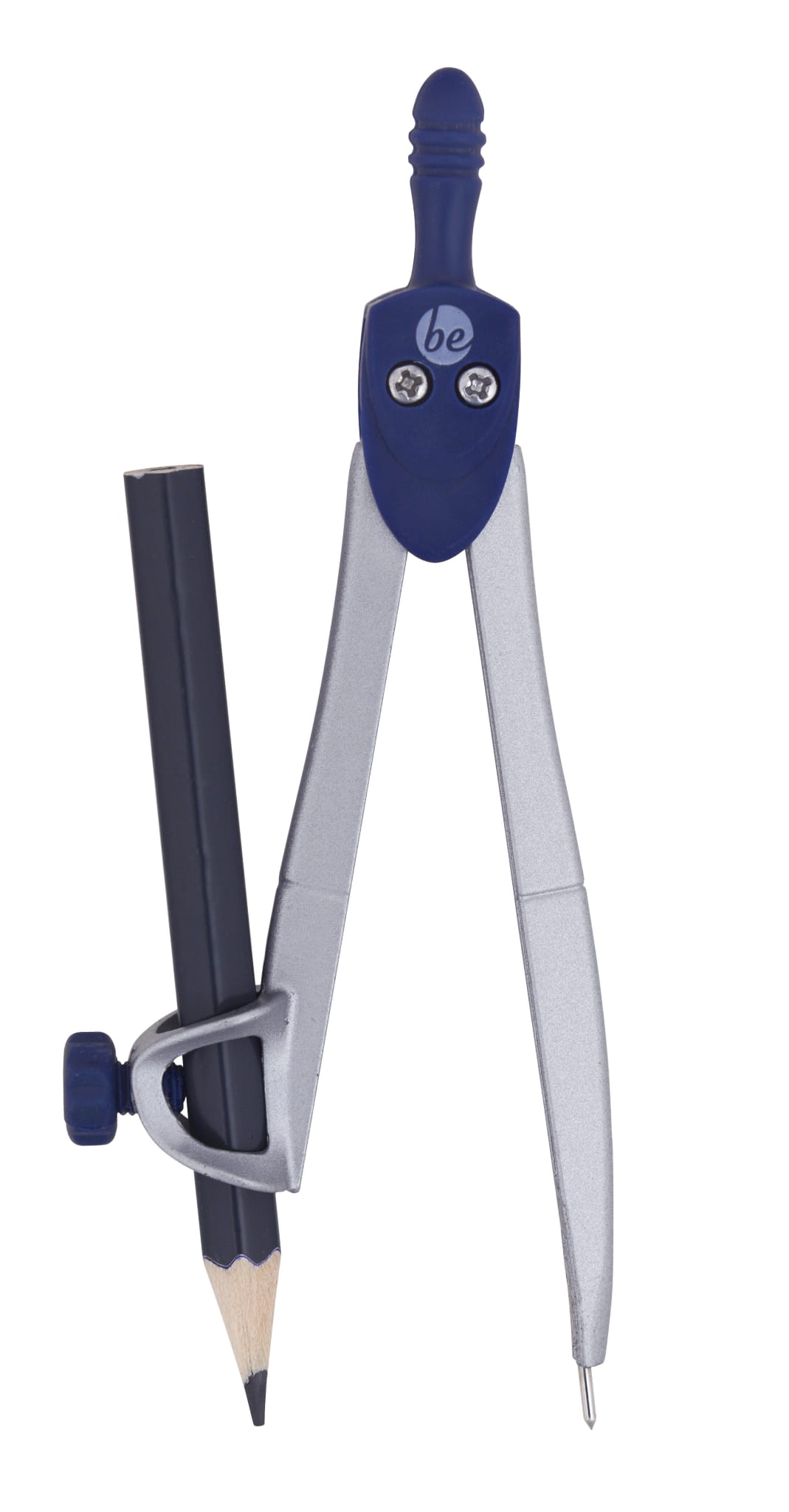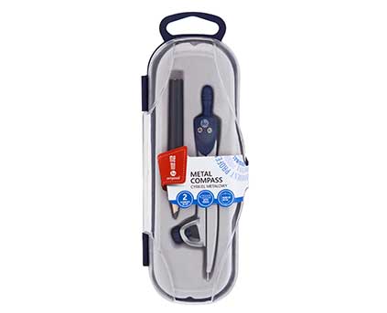 Metalowy cyrkiel z uchwytem na ołówek. Solidny mechanizm regulacji promienia rysowanych okręgów, zapobiega efektowi „elipsy” przy mocniejszym przyciśnięciu cyrkla do papieru.